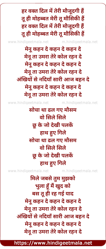 Lyrics of Menu Kehn De - हर वक्त दिल में तेरी मौजूदगी हैं