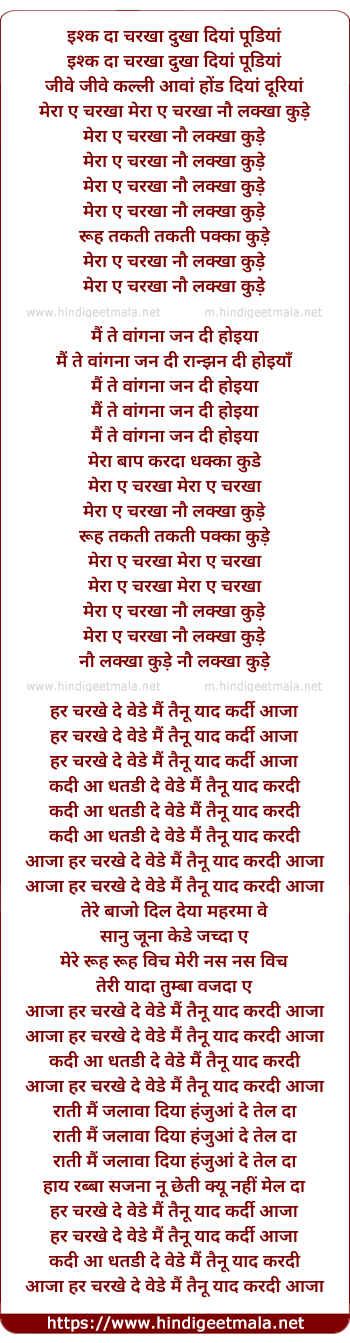 Lyrics of Mera Ae Charkha Nolakha - इश्क दा चरखा दुखा दियां पूडियां