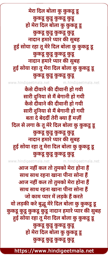 Lyrics of Mera Dil Bola Ku Kukdu Du Du - मेरा दिल बोला कु कुकडू डू डू