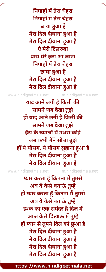 Lyrics of Mera Dil Deewana Hua Hai - मेरा दिल दीवाना हुआ है