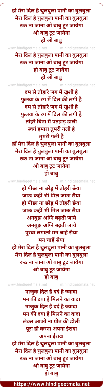 Lyrics of Mera Dil Hai Chulbula Pani Ka Bulbula - मेरा दिल है चुलबुला पानी का बुलबुला
