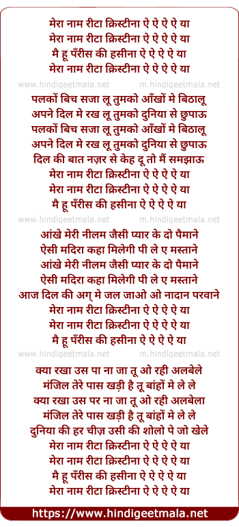 Lyrics of Mera Naam Rita Christina - मेरा नाम रीटा क्रिस्टीना