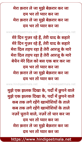 Lyrics of Mera Qarar Leja, Mujhe Beqarar Kar Ja, Dum Bhar To Pyar Kar Ja - मेरा क़रार लेजा, मुझे बेक़रार कर जा, दम भर तो प्यार कर जा