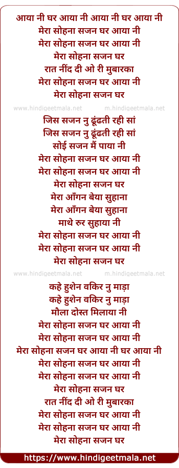 Lyrics of Mera Sohna Sajan - आया नी घर आया नी आया नी घर आया नी