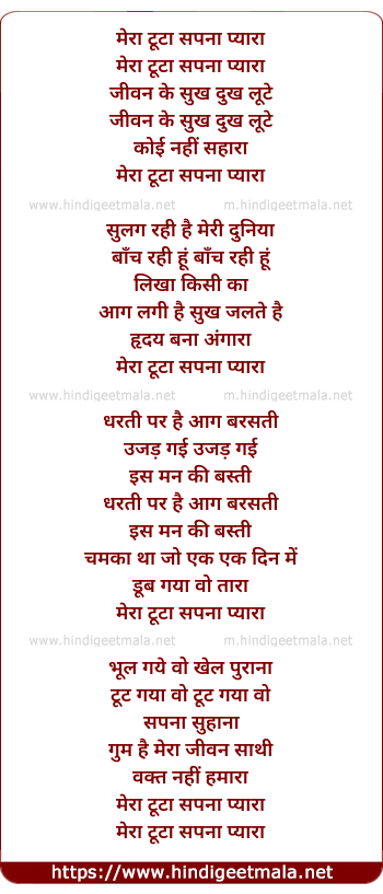 Lyrics of Mera Tuta Sapna Pyara - मेरा टूटा सपना प्यारा