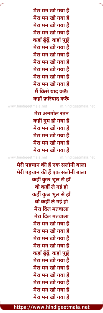 Lyrics of Meraa Mann Kho Gaya Hai - मेरा मन खो गया हैं
