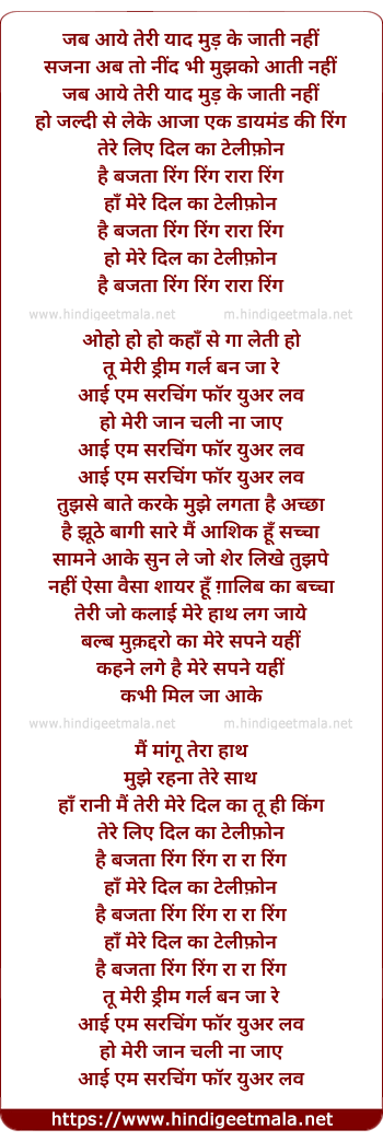 Lyrics of Mere Dil Kaa Telephone Hai Bajtaa - मेरे दिल का टेलीफ़ोन है बजता