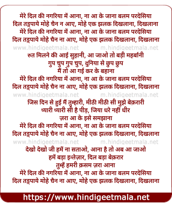 Lyrics of Mere Dil Ki Nagariya Me Aana, Na Aa Ke Jana Balam Pardesiya - मेरे दिल की नगरिया में आना, ना आ के जाना बलम परदेसिया