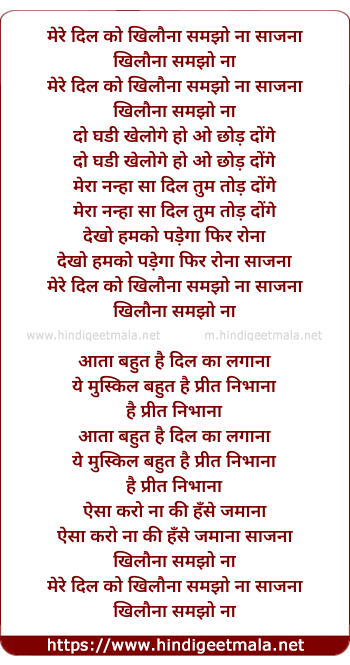Lyrics of Mere Dil Ko Khilauna Samjho Na Saajna - मेरे दिल को खिलौना समझो ना साजना