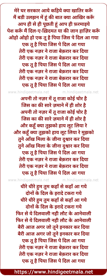 lyrics of song Mere Ghar Aap Aaye, Ek Tu Hai Piyaa Jis Pe Dil Aa Gayaa