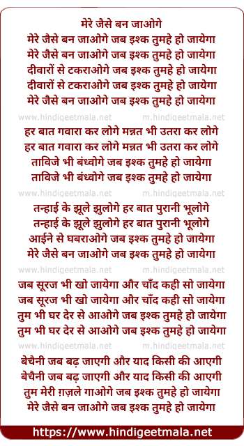 Lyrics of Mere Jaise Ban Jaoge Jab Ishq Tumhe Ho Jayega - मेरे जैसे बन जाओगे जब इश्क तुमहे हो जायेगा