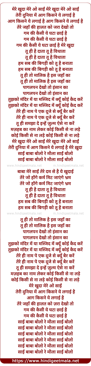 Lyrics of Mere Khuda O Mere Saai - मेरे खुदा मेरे ओ साईं मेरे खुदा मेरे ओ साईं