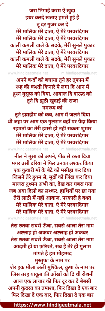 Lyrics of Mere Malik Mere Daata, Ae Mere Parwardigar - मेरे मालिक मेरे दाता, ऐ मेरे परवरदिगार