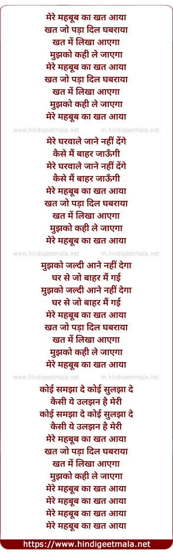 Lyrics of Mere Mehboob Ka Khat Aaya - मेरे महबूब का खत आया