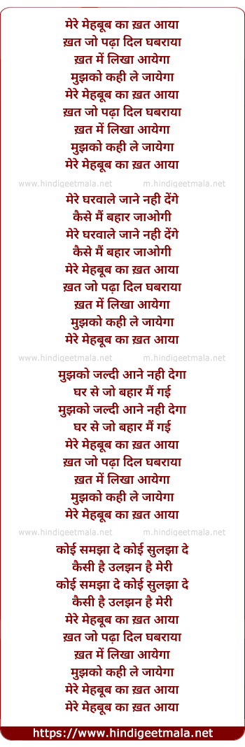 Lyrics of Mere Mehboob Ka Khat Aaya - मेरे मेहबूब का ख़त आया