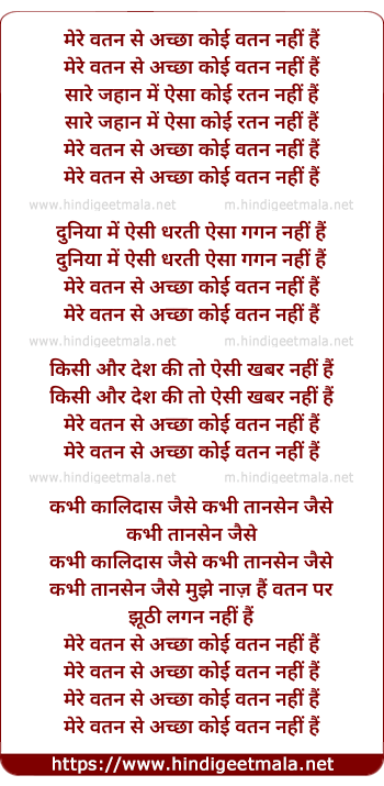 Lyrics of Mere Watan Se Aacha Koi Watan Nahi Hai - मेरे वतन से अच्छा कोई वतन नहीं हैं