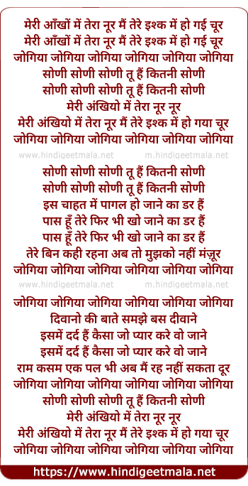 Lyrics of Meri Aankhon Men Teraa Nur, Jogiyaa Jogiyaa - मेरी आँखों में तेरा नूर, जोगिया जोगिया