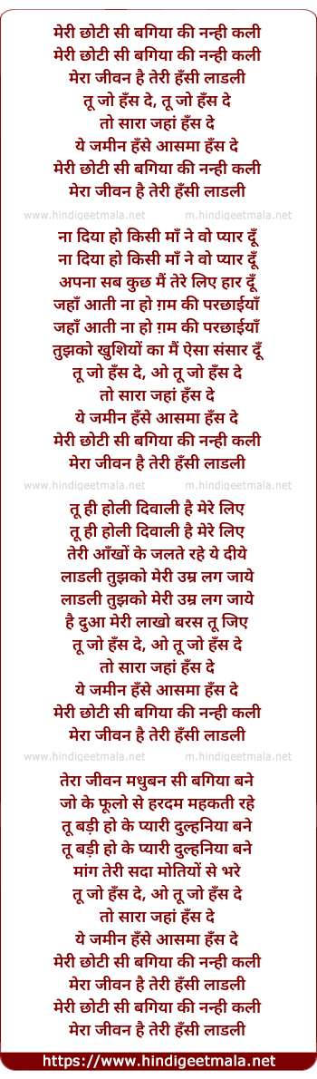 Lyrics of Meri Chhoti Si Bagiya Ki Nanhi Kali - मेरी छोटी सी बगिया की नन्ही कली