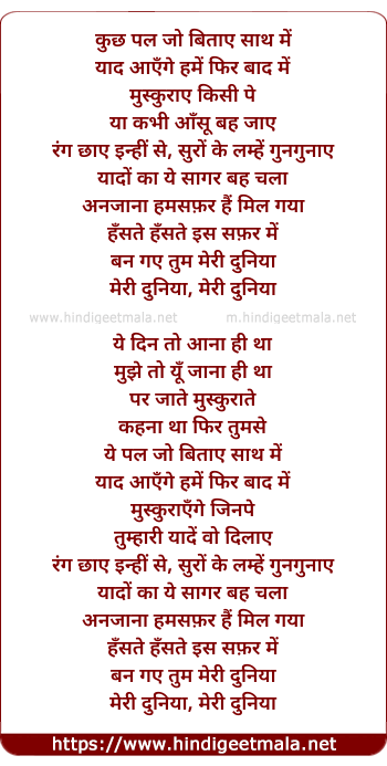 Lyrics of Meri Duniyaa - कुछ पल जो बिताए साथ में