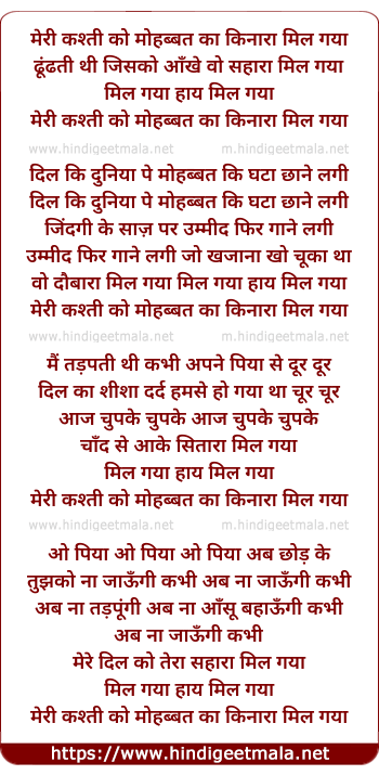 Lyrics of Meri Kashti Ko Mohabbat Ka Kinara Mil Gaya - मेरी कश्ती को मोहब्बत का किनारा मिल गया