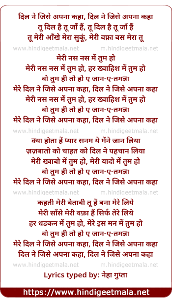 Lyrics of Meri Nas Nas Me Tum Ho, Har Khwaahish Me Tum Ho - मेरी नस नस में तुम हो, हर ख्वाहिश में तुम हो