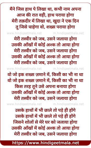 Lyrics of Meri Tasveer Ko Jab Usne - मैंने जिस हाथ पे लिखा था, कभी नाम अपना