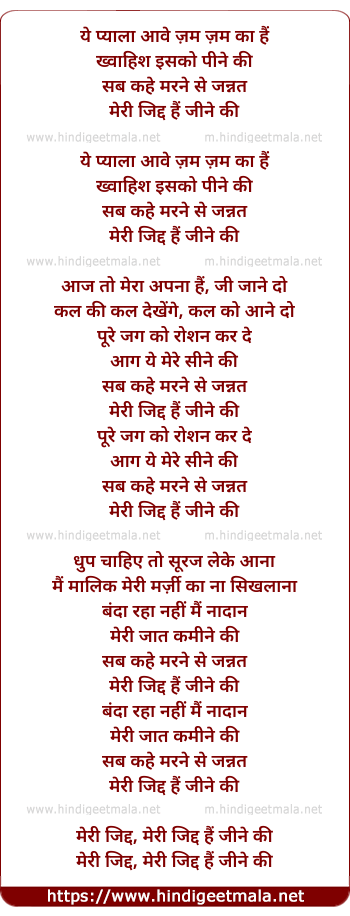 Lyrics of Meri Zidd Hai Jeene Ki - मेरी जिद्द हैं जीने की