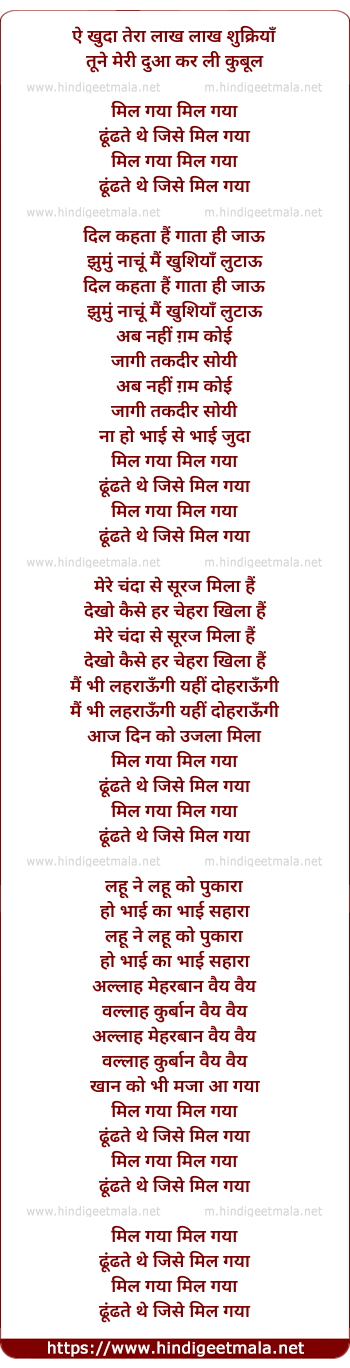 Lyrics of Mil Gaya Mil Gaya - मिल गया मिल गया