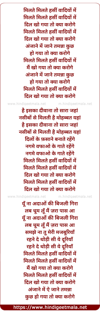 Lyrics of Milate Milate Haseen Waadiyon Mein - मिलते मिलते हसीं वादियों में
