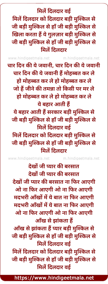 Lyrics of Mile Dildaar Ko Dildar Badi Mushkil Se - मिलें दिलदार को दिलदार बड़ी मुश्किल से
