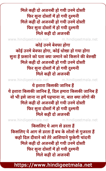 Lyrics of Mile Kahi Do Ajnabi, Ho Gayi Unme Dosti - मिले कही दो अजनबी हो गयी उनमे दोस्ती