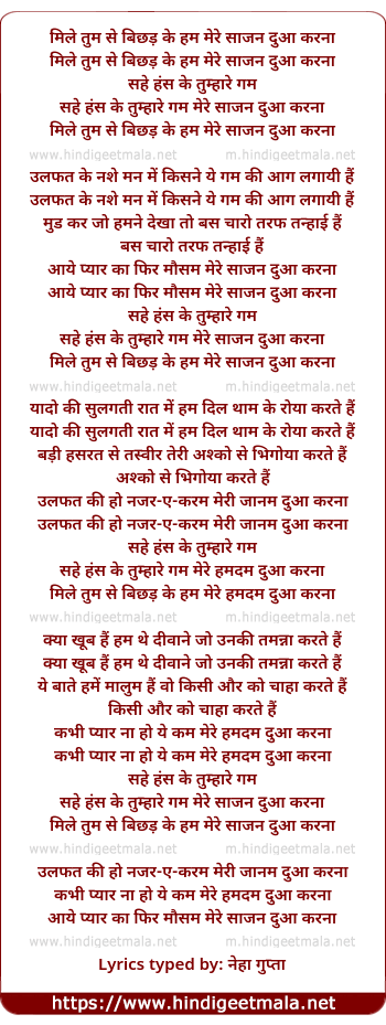 Lyrics of Milen Tumase Bichhad Ke Ham Mere Saajan Duaa Karanaa - मिले तुम से बिछड़ के हम मेरे साजन दुआ करना