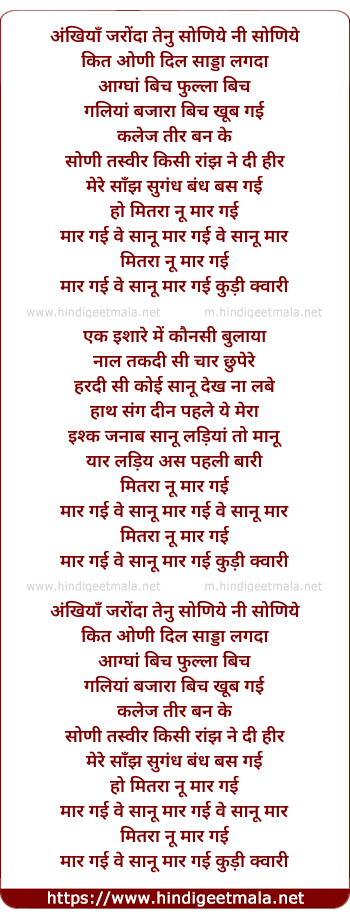 Lyrics of Mittra Nu Maar Gaye - अंखियाँ जरोंदा तेनु सोणिये नी सोणिये