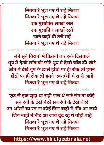 Lyrics of Mitwa Re Bhool Gaye The Rahe Mitva - मितवा रे भूल गये थे राहे मितवा