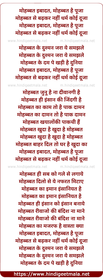 Lyrics of Mohabbat Ibadat Hai - मोहब्बत इबादत है