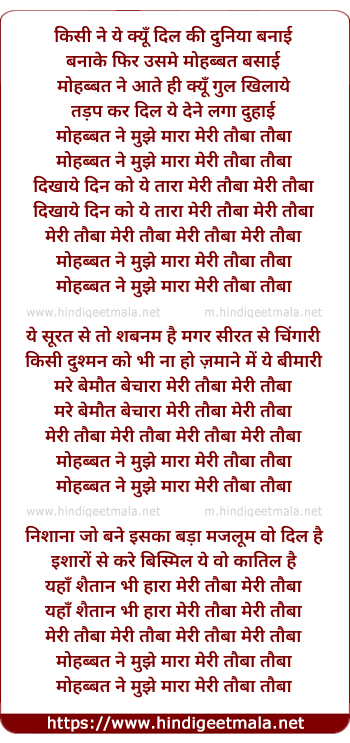 Lyrics of Mohabbat Ne Mujhe Maara Meri Tobba - मोहब्बत ने मुझे मारा मेरी तौबा