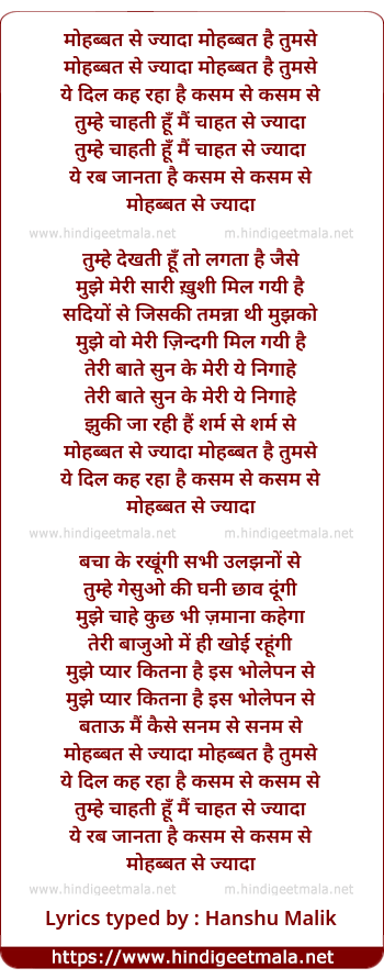 Lyrics of Mohabbat Se Jyaada Mohabbat Hai Tumse (Female) - मोहब्बत से ज्यादा मोहब्बत है तुमसे