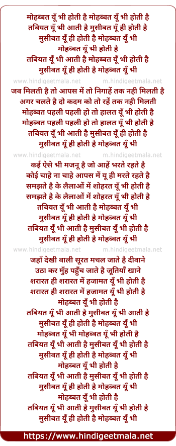 Lyrics of Mohabbat Yu Bhi Hoti Hai - मोहब्बत यूँ भी होती है