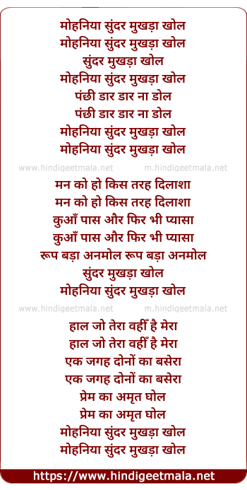Lyrics of Mohaniyaa Sundar Mukhadaa Khol - मोहनिया सुंदर मुखड़ा खोल