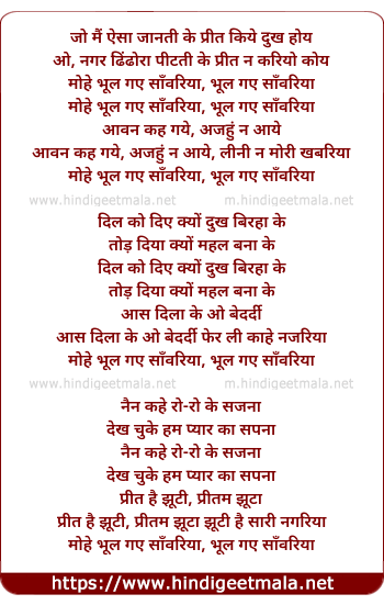 Lyrics of Mohe Bhul Gaye Sanwariya - मोहे भूल गये साँवरिया