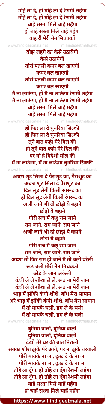 Lyrics of Mohe La De Reshmi Lehanga - मोहे ला दे, हो मोहे ला दे रेशमी लहंगा