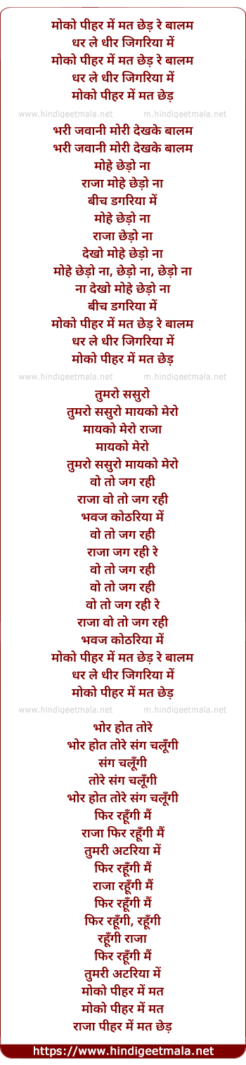 Lyrics of Moko Pihar Me Mat Chhed Re Baalam - मोको पीहर में मत छेड़ रे बालम