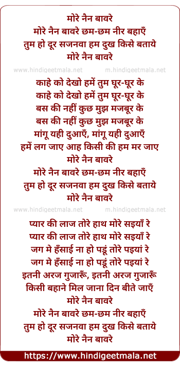 Lyrics of More Nain Baavare Chham Chham Nir Bahaaye - मोरे नैन बावरे छम छम नीर बहाये