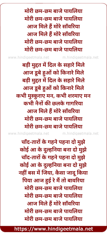 Lyrics of Mori Chham Chham Baje Payaliya - मोरी छम-छम बाजे पायलिया