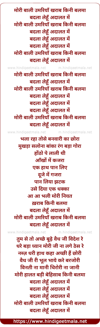 Lyrics of Mori Bali Umariya Kharab Kini Balma - मोरी बाली उमरियाँ खराब किनी बलमा