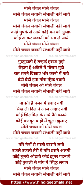 Lyrics of Mose Chanchal Jawani Sambhali Nahi Jaye - मोसे चंचल जवानी संभाली नहीं जाये