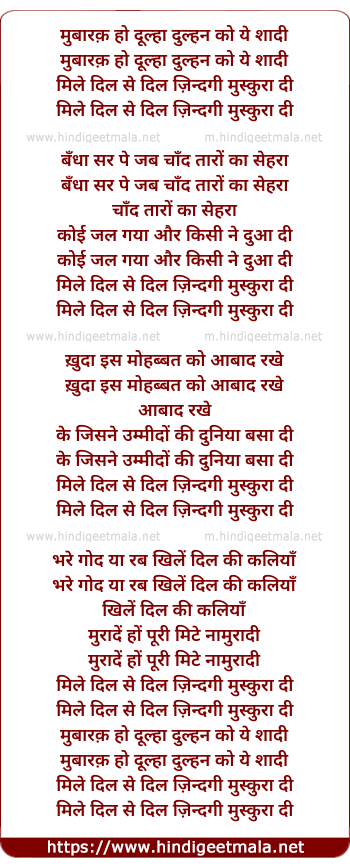 Lyrics of Mubarak Ho Dulha Dulhan Ko Ye Shadi, Mile Dil Se Dil Zindagi Muskura Di - मुबारक़ हो दूल्हा-दुल्हन को ये शादी, मिले दिल से दिल जिन्दगी मुस्कुरा दी
