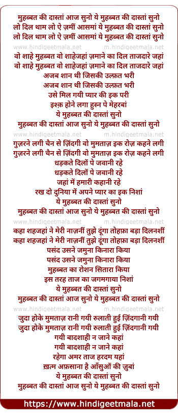 Lyrics of Muhaabbat Ki Daastaan Aaj Suno - मुहब्बत की दास्तां आज सुनो