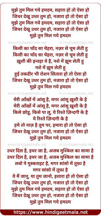 Lyrics of Muje Tum Mil Gaye Humdam - मुझे तुम मिल गये हमदम
