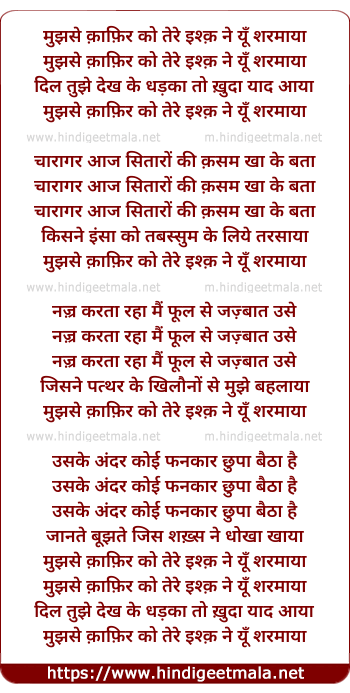 Lyrics of Mujhase Kafir Ko Tere - मुझसे क़ाफ़िर को तेरे इश्क़ ने यूँ शरमाया